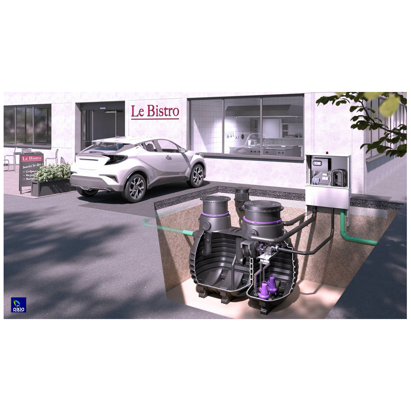 Solution enterrée tout-en-un avec station de relevage, étanche et robuste. Classes A/B/D, NS 4 à 10.